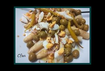 -Escurrimos los espárragos, el atún y las aceitunas-Pelamos y troceamos los huevos-Troceamos las guindillas-Ponemos todo en una ensaladera, aliñamos y removemos bien