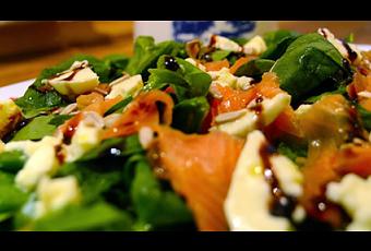 - Disponemos esta mezcla encima con cuidado solamente en el momento de servir y listo ya tenemos una exquisita ensalada de espinaca y salmón ahumado.