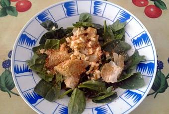 Colocamos las hojas de espinacas limpias, los corazones de alcachofas cocidos, un diente de ajo partido muy pequeño y el sésamo espolvoreado por encima, aliñamos con sal, zumo de un limón y aceite de oliva.