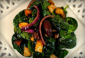 Hola a todos...Aquí os traigo una deliciosa ensalada preparada con brotes de espinaca combinada con dátiles, almedras y croutons de pan pita al horno, una mezcla de sabores y texturas estupenda!!, ahí os la dejo....