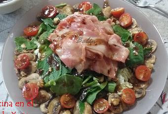 Ingredientes:1 bolsa de espinacas frescas200 gr de champiñones frescos laminados4 dientes de ajo1 bola de mozarella6-8 lonchas de beicon10 tomatitos cherrie1 cucharadita de mostaza antiguaAOVEvinagre balsámico de módenasal