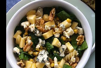 Se pelan las nueces y se parten en trocitos. Se corta también el queso azul. Se dispone en la ensaladera la pasta, se añaden las espinacas, los dados de manzana, el maíz, el queso y las nueces.