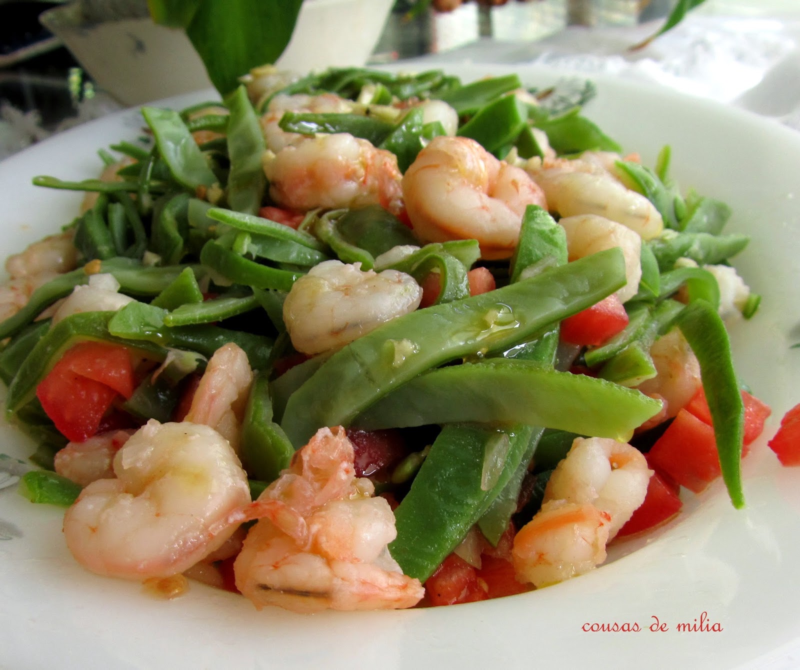 Seguramente estos días de fiesta el que más y el que menos ha hecho algún exceso... yo confieso que unos cuantos! Por eso no quiero poner ninguna receta excesiva... ya habrá tiempo! así que di una vuelta por el borrador y encontré esta ensalada de judías que me pareció bien adecuada para aligerar la conciencia. La receta es de mi admirado Martín Berasategui y está muy buena.Ingredientes:1 k de judías verdes (las mías recién recogidas)500 g de gambas peladas1 tomate maduro1 cebolleta6 cucharadas de aceite de oliva virgen2 cucharadas de vinagre de sidra1 diente de ajo SalElaboración:Limpiar las judías verdes, retirándoles los nervios y los dos extremos, y cortarlas en tiras. Cocerlas en abundante agua hirviendo con con sal, sin taparlas, por espacio de siete u ocho minutos. Escurrirlas y refrescarlas en abundante agua salada helada, en la que nadarán cubos de hielo. De esta forma se refrescan y mantienen su color verde vivo. Escurrilas y reservarlas en un bol. pelamos entonces el tomate, lo despepitamos y lo cortamos en dados muy pequeños. Hacemos lo mismo con la cebolleta, pero picándola muy menuda.en el momento de servir la ensalada preparamos una vinagreta con el aceite, el vinagre, la sal y el ajo, batiéndolas con las púas de un tenedor. Añadir la salsa al bol en el que tenemos las judías verdes escurridas y frescas y dar un buen meneo para que se impregne bien todos los ingredientes. añadimos también los dados de tomate y la cebolleta.Salteamos entonces, solo ahora las gambas, para que no se sequen y lleguen tibias a la mesa. Primero las sazonamos. Luego añadimos una pizca de aceite de oliva en una sartén antihaderente y, cuando humee, echamos las gambas peladas. Damos unas vueltas de unos segundos, justo para que cojan color y temperatura; deben quedar bien jugosas.Finalmente las retiramos del fuego y las añadimos a la ensalada. Servimos.