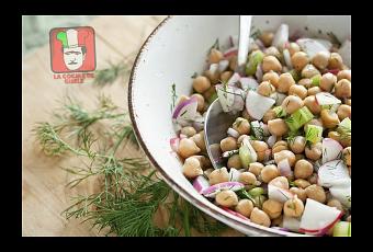 La ensalada de garbanzos es muy completa y es muy vistosa por el colorido que le aportan los vegetales y el sabor cítrico de una sencilla pero deliciosa vinagreta que la complementa a la perfección. Está compuesta por pepinos, tomates, cebolla morada o blanca (depende de los gustos de cada quien), pimentón rojo o verde, todos estos vegetales cortados en cubos. Puedes agregar perejil fresco finamente cortado que otorga un buen contraste con los demás ingredientes.