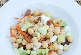 Ingredientes.- 1 bote de garbanzos cocidos.- 1 tomate kumato.- 1 aguacate.- 1 pepino.- Una tarrina de queso de Burgos.- Zanahoria rallada.