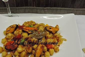 Sacamos la mitad de los mejillones para que no se nos rompan todos mucho, y añadimos los garbanzos.