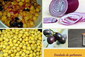 Mezcla en un bol los garbanzos, la cebolla y las aceitunas.