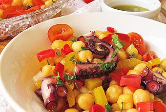 Os dejo como hacer esta ensalada de garbanzos, acompañada de pulpo cocido