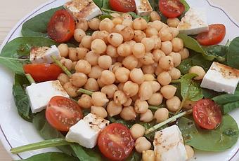 - Lavar y escurrir un bote de garbanzos cocidos y poner en un plato, sobre hojas frescas de espinaca; añadir tomates cherry cortados a la mitad y trocitos de queso fresco. - Aliño: Mezclar 2 cuch. de zumo de limón, ¼ vaso de aceite de oliva, sal, pimienta, ajo en polvo y ½ cdta. de ras el hanout y comino. Agitar bien y echar sobre la ensalada.