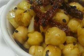 1 cebolla pequeña muy picadita6 Tomates secos en aceite de oliva en julianaAceite de Oliva Virgen ExtraVinagre de Manzana (o el que más os guste)Pizca de sal marina1 cucharada de curry en polvo1/2 cucharada de comino en polvosemillas de sésamo negro (opcional, esto es cosa de mi adicción a las semillas)Veréis que fácil y qué rápido... los garbanzos los vamos a enjuagar bajo el grifo; mientras en un cuenco añadimos la cebolla y los tomates secos, incorporamos los garbanzos, salamos, ponemos el curry, el comino, el aceite y el vinagre (al gusto), mezclamos bien para que se incorporen todos los sabores y metemos al frigorífico una hora para que macere...Pasada la hora de maceración... emplatamos, ponemos unas semillas de sésamo negro y a dejarnos llevar por los aromas, los sabores y las texturas de esta ensalada que desde ahora será un básico en casa.