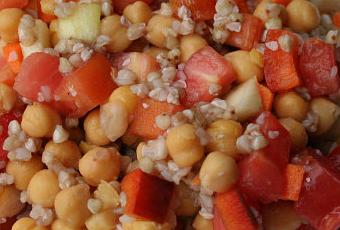 Cocemos el trigo serraceno en agua hirviendo durante unos 10-12 minutos (ir mirando como está hasta que quede blando) y lo mezclamos en un bol con los garbanzos cocidos.