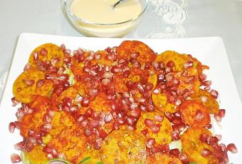 Pelar y desgranar la granada esparciendo los granos por la superficie. Regar la superficie con el zumo del medio limón.