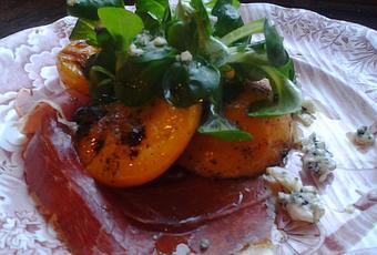- Primero de base las lonchas de jamón los melocotones encima , sobre ellos los berros y esmagamos el queso azul .....