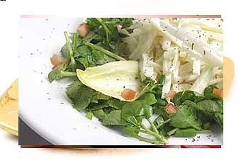4 cdas. aceite 1 cuenta de berro4 endibias1 cdta. de jengibre picado1 limón4 manzanas verdes1 dl. de mayonesa50 grs. de nueces peladas1 remolacha pelada y crudaSal y pimienta a gustoPreparación: Blanquear el jenjibre bien picadito por unos 3 min. en agua sin sal.Rebanar finamente la remolacha pelada, y posteriormente cortarla en juliana lo más delgada posible. Hecho ésto se la coloca en un bol con agua helada durante 10 minutos.Pelar y rebanar las manzanas bien finamente y luego bañarlas en agua con limón durante unos 3 min. Pasado este tiempo escurrirlas y reservar.Picar en juliana larga las endivias, dejando sus puntas intactas para la presentación.En un bol grande mezclar las manzanas junto con las endivias, las nueces, el jengibre escurrido, la mayonesa, el aceite, la sal y pimienta a gusto.Mezclar bien para que se integren todos los sabores y presentar en un plato en forma de pirámide adornando alrededor con el berro y decorando con la juliana de remolacha (bien escurrida).Fuente: Recetas