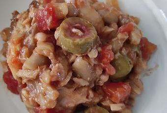 1 bote pequeño de judías blancas 4 filetes grandes de caballa (o 2 latas de atún en aove) 4-6 aceitunas gordal rellenas de ajo (o al gusto) 1/2 cebolla asada partida en láminas 1/2 bote de tomate en trozos o 2 tomates