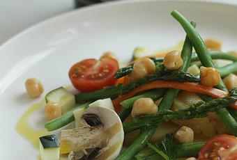 Poner en el plato la patata cocida junto con las verduras y los garbanzos.