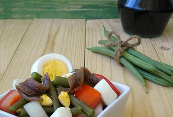 Ahora viene lo emocionante de la receta, el montaje de nuestra estupenda ensalada de verano, así que en una ensaladera echamos los dados de tomate, la cebolla picada, las judías, los huevos cocidos partidos en rodajas o en trocitos y los filetes de anchoas colocados de forma irregular sobre la ensalada.