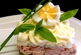 Colocamos un molde de emplatar rectangular o redondo como más os guste, colocamos unas cuantas patatas y las chafamos contra el plato y el molde, colocamos encima las judías con la ayuda de unas pinzas (en su defecto con las manos) mirando que queden colocadas y alineadas con el molde, otra capar de atún, que chafaremos con el tenedor y otra capa de patatas, coronamos con la mayonesa que en este caso hemos colocado con la ayuda de una manga pastelera, medio huevo cocido y listos.Un plato rápido y aparente. un saludo