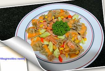 Hoy plato fresquito una ensalada de pasta como a nosotros nos suele gusta en casa. Pero esta ocasión algo diferente.INGREDIENTES:50 gr de LOSITOS FARFALLE ARANCIONI MARRONVERDI50gr de langostinos cocidos8 palitos de cangrejo4 trozos de piña natural½ bote de PERLAS DE WASABI1 pepino100 gr de salmón ahumado1 lata de atún al natural½ lata de maízPARA EL ALIÑO:Aceite de oliva virgen3 ajos picaditosPimientaELABORACIÓN:En una cazuela alta con un litro de agua por cada 100g de pasta y sal.La sal se añade en el momento que el agua empieza a hervir. Introduciremos la pasta y dejaremos que cueza unos 6 07 minutos aproximadamente. A la hora de escurrir la pasta, guardaremos vaso de agua de la cocción por si se seca demasiado, poder rehidratarla. Mientras la pasta se enfría cortaremos a tiras finas el salmón, cortaremos el pepino a trocitos los palitos de cangrejo y pelaremos los langostinos y por último la piña a trocitos. Lo añadiremos a la ensalada junto con la lata de atún escurrido y el maíz y por ultimo picaremos en un mortero los ajos con un poco de sal y pimienta y añadiremos un chorrito de aceite de oliva y mezclamos bien. Lo introduciremos a la en salada y por último las perlas de wasabi.