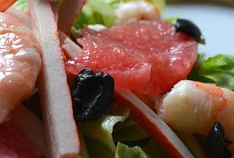 Desechamos las cabezas y ponemos las colas sobre la lechuga y el pomelo.