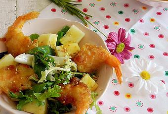 Una combinación que en casa nos gusta mucho es darle un toquecito oriental a las ensaladas, con un puntito de salsa de soja y con fruta. Los langostinos en tempura ya le dan el puntito siendo sabores que se complementan a la perfección!!