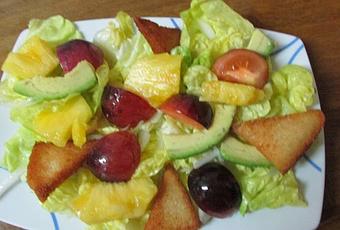 Le echamos la vinagreta a la ensalada, menos al pan, para que tomen el sabor y decoramos con el pan por encima.
