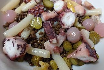 Ingredientes para 4 personas:400 g de lentejas caviar cocidas o pardinas2 tentáculos de pulpo cocido1 lata de espárragos blancosPepinillos y cebollitas en vinagrePara la vinagreta:2 cucharadas de vinagre de manzana4 cucharadas de aceite oliva virgen extra1 cucharadita de mostaza de DijonSalPreparación:Como las lentejas y el pulpo ya están cortados, la ensalada es rápida de preparar.Cortar el pulpo en trozos. Al igual los espárragos y los pepinillos en vinagre.Poner las lentejas en una ensaladera y añadir el resto de ingredientes.Preparar el aliño, mezclando un recipiente el vinagre, con la mostaza y el aceite, batir con una varilla de mano.Aliñar por encima con la vinagreta.