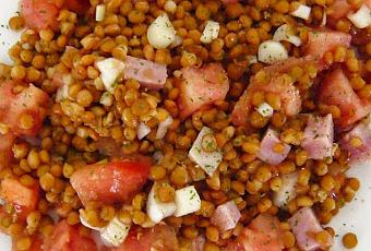 - En un bol ponemos las lentejas (que ya habrán escurrido), la cebolleta, los rabanitos, el fiambre de pavo y el tomate. Añadimos una pizca de sal y 2 cucharadas soperas de aceite de oliva virgen extra. Y si nos apetece, a esta ensalada le va muy bien el aderezo de ajo y perejil, fresco o seco de bote. Si lo ponemos fresco, lo picamos muy fino y lo incorporamos, pero tened en cuenta que si lo penéis fresco, el sabor será más intenso, así que con un diente de ajo pequeño será más que suficiente.