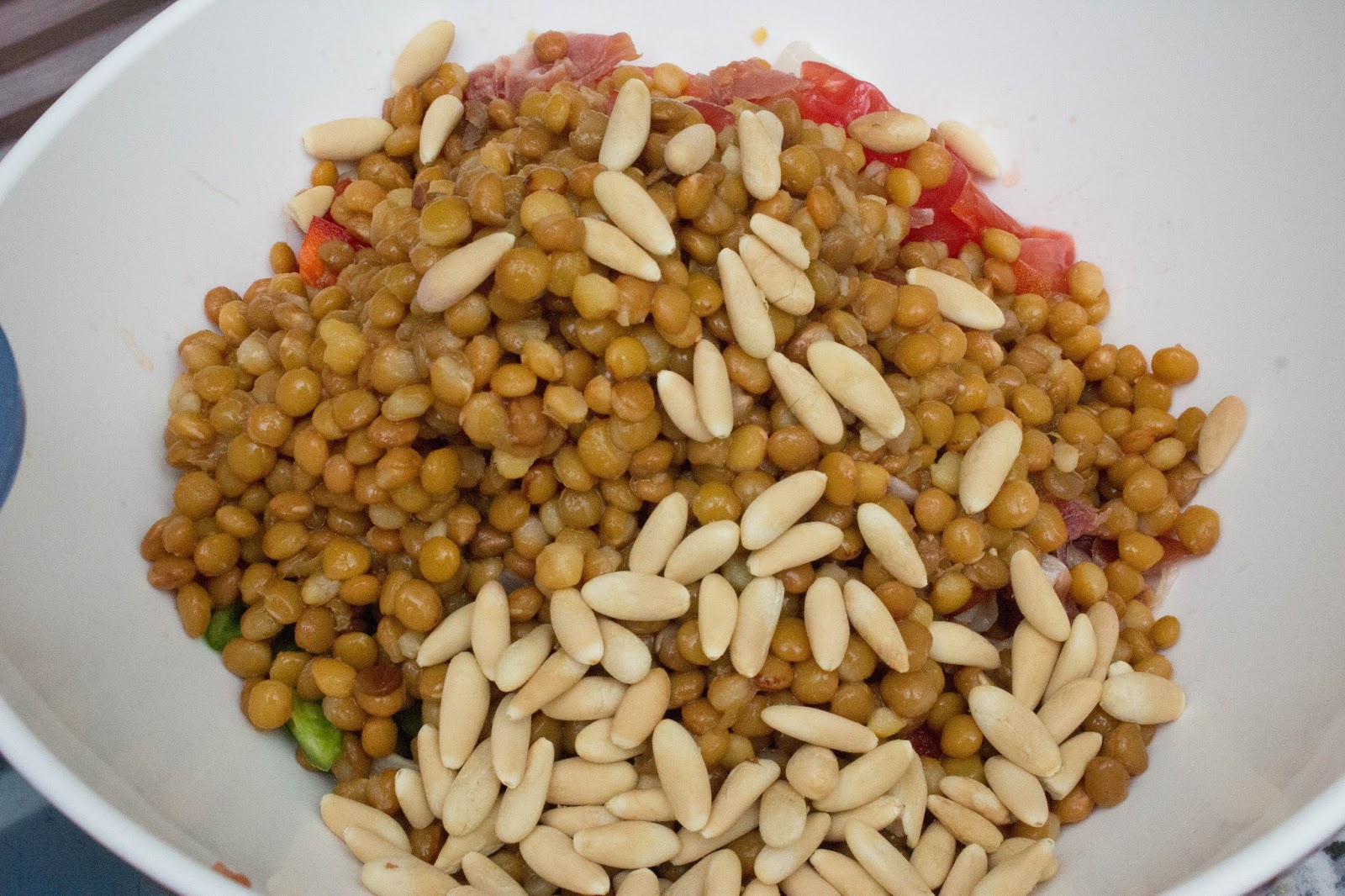 Ingredientes 1 persona:Media manzana1 pimiento verde1 cuarto de pimiento rojo3 espárragos blancos1 mini tomate (puedes omitirlo si no te lo permiten por la histamina)medio tarro de lentejas cocidas1 puñado de piñonesjamón serranoaceitesalespecias