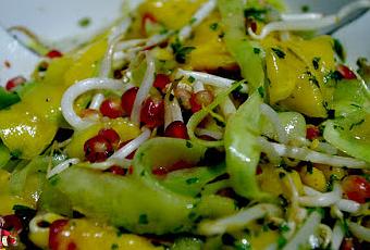 Ingredientes: 1 pepino holandés; 1 mango; 1/2 granada; 100 g brotes de soja; 1/2 limón; 3 cucharadas aceite; sal; pimienta; 1/2 cucharadita guindilla molida.