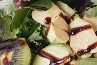 Para hacerla:Fácil, super fácil…….Brotes tiernos (uso del Mercadona), manzana Golden cortada en trozos, kiwi y aguacate de La Axarquia malagueña, sal al gusto y regado generosamente con vinagre de Módena con higos.