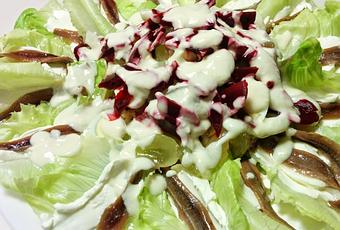 - En la ensaladera, vamos colocando las hojas de cogollo untadas por el borde y colocamos sobre cada una de ellas una anchoa.