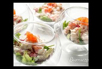 Descongelar la merluza y las gambas. Cocinar por separado, bien al vapor, bien en el microondas, en un recipiente apropiado, con un poco de sal y unas gotas de aceite. Dejar enfriar.