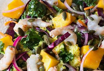 Para montar la ensalada ponemos el mijo y la col kale en la base y disponemos por encima la col lombarda, la cebolla roja, el melocotón y las gambas. Preparamos una vinagreta suave con una parte de vinagre de vino blanco, o de arroz, y tres partes de aceite junto con un poquito de sal. Aliñamos y acabamos con unas pipas de calabaza tostadas.