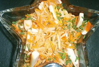 Repartir sobre la ensalada y decorar con el cebollino picado.
