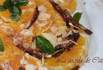 Aderezamos con el agua de azahar y esparcimos un poco de la menta picada y canela por encima de la ensalada.