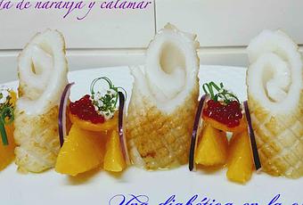 - En una sartén antiadherente, a fuego fuerte y con la sartén bien caliente marcamos el calamar primero por la parte donde hemos hecho la rejilla, así al darle la vuelta una vez dorado, se enroscara formando una especie de tubo. Doramos por la parte de fuera y retiramos de la sartén. Dejamos que se temple y lo cortamos a nuestro gusto.