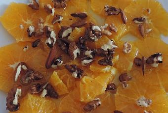 Se pelan las naranjas y se cortan en rodajitas, se disponen en un plato llano y se le añade encima nueces peladas y almendras también le he puesto algunas, luego le añado miel líquida por encima y la dejo reposar en la nevera una hora más o menos, y ya está, es facilísima, si quieres también le puedes añadir, dátiles, platano a rodajas, fresas, canela, etc. de cualquier forma está deliciosa.