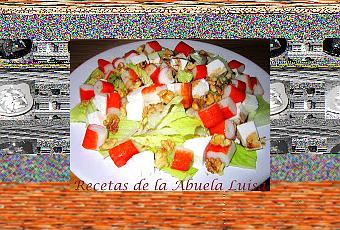 - Lavamos y troceamos la lechuga, la disponemos sobre un plato amplio o una ensaladera. - Disponemos sobre la lechuga los palitos de cangrejo cortados, el queso en dados y las nueces troceadas. - Aliñamos con el vinagre (podemos usar el que mas nos guste), la sal y el aceite.