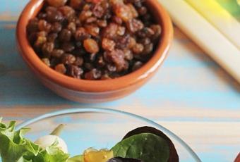 Ensalada de palmitos, manzana caramelizada y frutos secos.