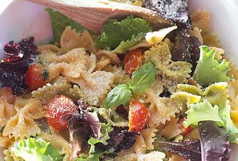 5. Para montar la ensalada mezclamos la pasta cocida con la salsa preparada. Mezclamos con los brotes de lechuga y espolvoreamos con el queso parmesano rallado o en escamas.