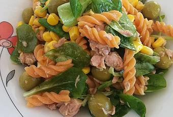 Hacemos la pasta como nos diga el fabricante. Una vez esté cocinada la escurrimos bien y la ponemos en un bol grande, dejamos que se enfríe un poco antes de empezar añadir los ingredientes. Añadimos la ensalada variada, la lata de atún escurrida, el maíz dulce, las aceitunas, un chorrito de vinagre, un buen chorrito de aceite de oliva virgen extra, un poquito de sal y removemos todo bien. Podemos comerla así o mas fresquita y para ello la meteríamos en la nevera unas horitas antes de comer.