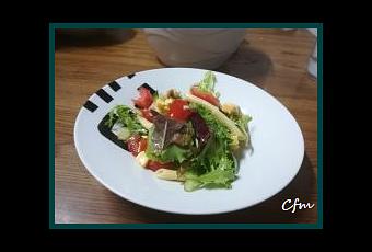 -Pasta para ensaladas-Una bolsa de primeros brotes-Tomates cherry-1 lata de atún al natural-Queso para ensaladas-Aceitunas verdes sin hueso-Palitos de surimi-Maiz en grano-1 kiwi-2 rodajas de piña en su jugo-Aceite de oliva-Vinagre de vino rojo-Sal