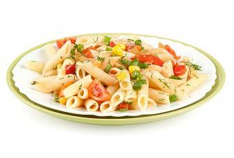 La deliciosa ensalada que ilustra la fotografía, nos enseña que con un poco de pasta, un tomate, maíz y algún condimento como puede ser perejil, orégano, etc., un poco de sal y aceite de oliva, podemos crear un plato nutritivo y muy energético.
