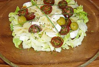 Picar 5 ramitas de cebollino. Poner las tiras de lechuga en una ensaladera en forma de nido, poner la pasta en el hueco central, añadimos los tomatitos, los trozos de quesitos, el cebollino picado y las aceitunas verdes.