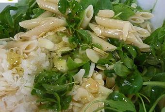 Lavamos las hojas de rúcula y secamos bien, las ponemos en un bol grande o en una ensaladera, añadimos la pasta cocinada.