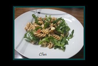 -Una bolsa de rúcula lavada y escurrida-Pasta integral cocida-1 tomate de ensalada limpio y cortado en dados-2 solomillos de pollo a la placha y troceados-Unas lascas de queso curado-Aceite de oliva-Vinagre rojo-Sal