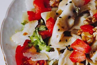 Pasta fresca rellena de espinacas y ricotaLechugaTomateNueces 1 Ciruela roja Semillas de sésamoAceite de Oliva Virgen ExtraVinagre balsámicoSal Láminas de queso parmesano