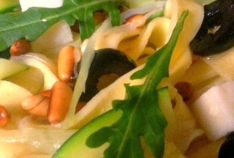 - 350 gr. de pasta, parppadelle- 1 ó 2 calabacines- 2 cebolletas- Piñones- Aceitunas negras sin hueso- Queso de cabra cortado en dados- 1 bolsa de rúcula o manojo