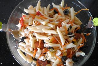 Elaboración:Lo primero que hacemos es cocer la pasta tal y como nos diga el paquete, dependiendo de si es pasta fresca o seca tardará más o menos tiempo. Cocerla con un poco de sal y un par de hojas de laurel. Una vez que está al dente se saca, se escurre, se refresca y se echa en una fuente. En una sartén echamos una cucharada de aceite y ponemos a freír las gambas con un par de dientes de ajo cortados en trocitos. Se sacan una vez que hayan soltado el agua y se añaden a la ensaladera. Poco a poco vamos añadiendo el resto de los ingredientes cortados en trocitos, salamos y aliñamos con aceite y vinagre. Si queremos darle más sabor al plato y aumentar el número de calorías, podemos sustituir este aliño por una salsa, como la mayonesa o la salsa rosa.